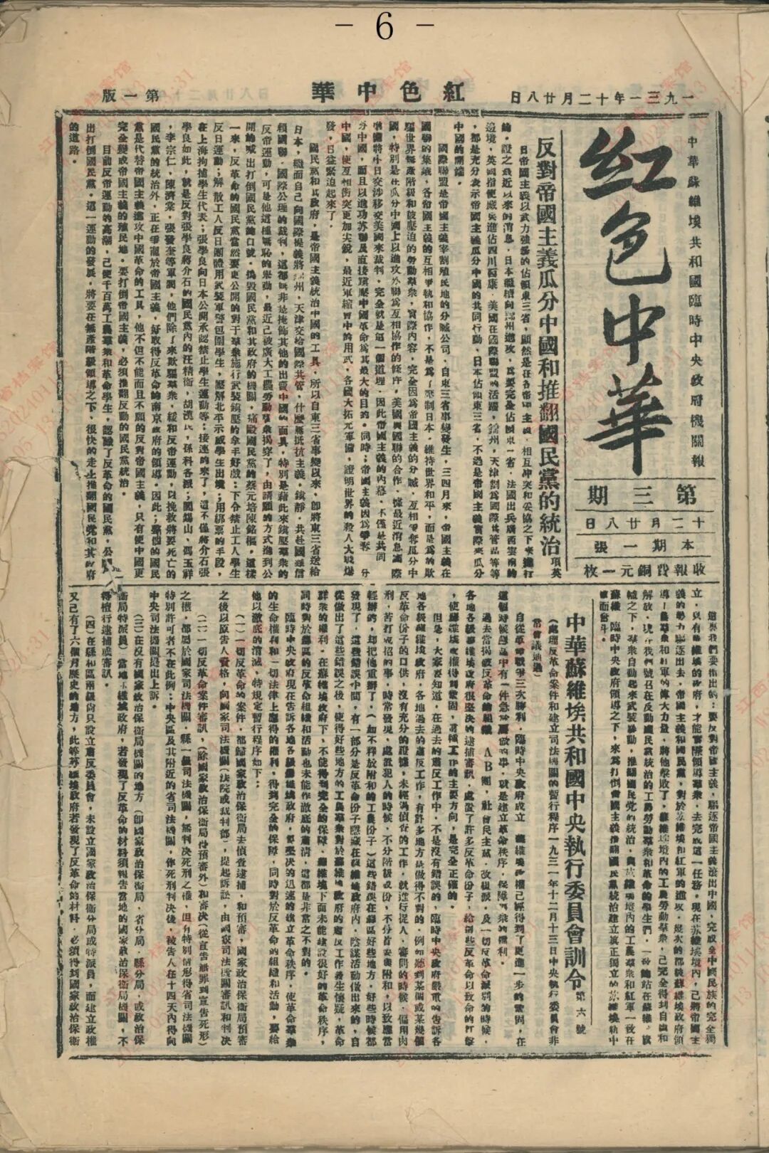 这是1931年12月28日出版的中华苏维埃共和国临时中央政府机关报《红色中华》(第3期),收藏于江西省档案馆。这期报纸第1版至第2版刊登了同年12月13日通过的《中华苏维埃共和国中央执行委员会训令第六号》(下称六号训令)。