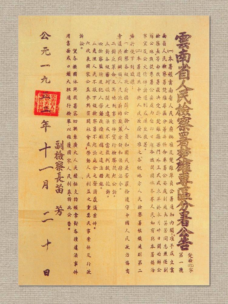 《公告》宣布云南省人民检察署楚雄专区分署成立,由专署公安处副处长苗芳兼任副检察长,办公地点在楚雄县西门外专署公安处内。