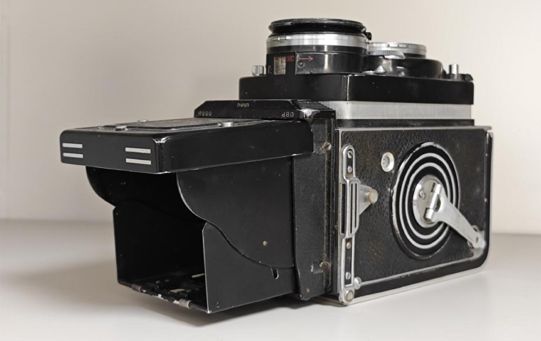 这是20世纪50年代最高人民检察院摄影师温士英使用的一台双镜头反光式相机,收藏于人民检察博物馆。相机长20cm,宽7.5cm,高9.5cm,品牌为Rolleiflex(禄来福莱克斯)。